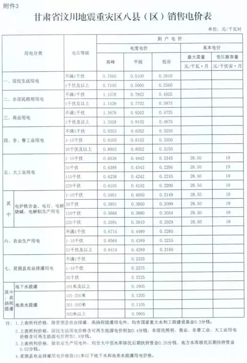 3、甘肅省汶川地震重災(zāi)區(qū)八縣(區(qū))銷售電價(jià)表