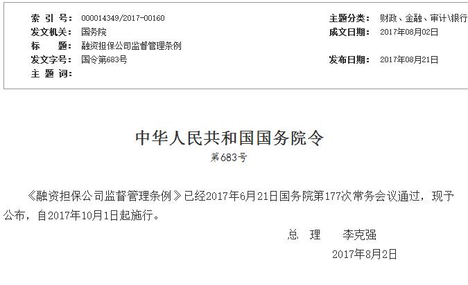 為了規(guī)范融資擔保公司的行為,防范風險,2017年8月2日,國務(wù)院總理李克強簽署國務(wù)院令683號,公布《融資擔保公司監(jiān)督管理條例》(以下簡稱條例),自2017年10月1日起施行。