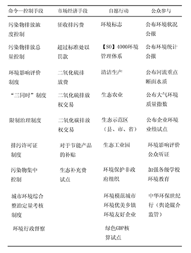 關(guān)于我國(guó)環(huán)境治理的實(shí)踐過程,張坤民等(2007) 建立了包栝命令—控制手段、經(jīng)濟(jì)刺激手段和公眾參與或稱自愿手段等多樣化的環(huán)境政策工具矩陣。見表2.1