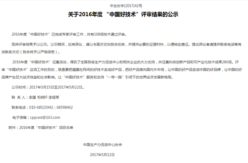 “中國好技術(shù)”是為深入貫徹落實(shí)黨中央、國務(wù)院關(guān)于實(shí)施創(chuàng)新驅(qū)動(dòng)發(fā)展戰(zhàn)略和“大眾創(chuàng)業(yè)、萬眾創(chuàng)新”的精神,不斷激發(fā)全社會(huì)的創(chuàng)新創(chuàng)業(yè)活力,營造全民創(chuàng)新的良好氛圍,由中國生產(chǎn)力促進(jìn)中心協(xié)會(huì)同國家相關(guān)機(jī)構(gòu)和企業(yè)共同發(fā)起和舉辦的,此獎(jiǎng)項(xiàng)評(píng)選為每年一次。在2016年度“中國好技術(shù)”征集中,得到了全國各級(jí)生產(chǎn)力促進(jìn)中心和相關(guān)企業(yè)的大力支持,共征集科技創(chuàng)新產(chǎn)品和可產(chǎn)業(yè)化技術(shù)成果286項(xiàng),獲得“中國好技術(shù)”稱號(hào)有108個(gè)項(xiàng)目。評(píng)審“中國好技術(shù)”這項(xiàng)工作的目的,就是要把蘊(yùn)藏在民間的好技術(shù)變成好產(chǎn)品,把好產(chǎn)品推向國內(nèi)外市場(chǎng),讓中國的好產(chǎn)品變成中國的好品牌,讓中國的好品牌產(chǎn)生巨大經(jīng)濟(jì)效益和社會(huì)影響。讓“中國好技術(shù)”服務(wù)和支持“一帶一路”引領(lǐng)下的世界經(jīng)濟(jì)發(fā)展新格局,讓“中國好技術(shù)”走出國門,走向世界。