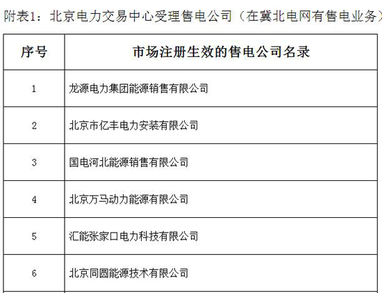 冀北電力交易中心有限公司于2017年10月19日至2017年11月19日共對(duì)13家售電公司進(jìn)行了公示,具體為:北京電力交易中心受理并在冀北電網(wǎng)有售電業(yè)務(wù)的龍?jiān)措娏瘓F(tuán)能源銷售有限公司等9家售電公司;北京電力交易中心推送業(yè)務(wù)范圍變更至冀北的北京經(jīng)開(kāi)智控能源管理股份有限公司等4家售電公司。