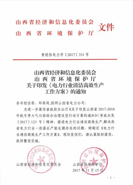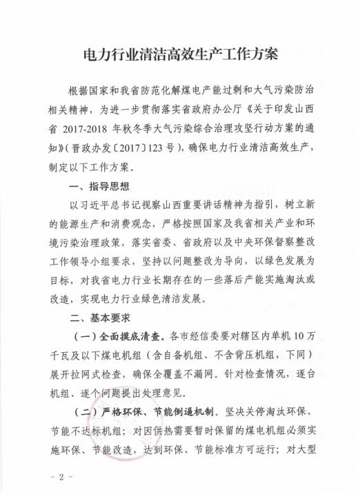 ??為進(jìn)一步落實(shí)省政府辦公廳《關(guān)于印發(fā)山西省2017-2018年秋冬季大氣污染綜合治理攻堅(jiān)行動(dòng)方案的通知》(晉政辦發(fā)〔2017〕123號(hào))精神,推進(jìn)電力行業(yè)清潔高效生產(chǎn),解決我省電力行業(yè)一些落后產(chǎn)能長(zhǎng)期存在的問題,特制定《電力行業(yè)清潔高效生產(chǎn)工作方案》,現(xiàn)印發(fā)你們,請(qǐng)認(rèn)真組織落實(shí),抓好整改實(shí)施。