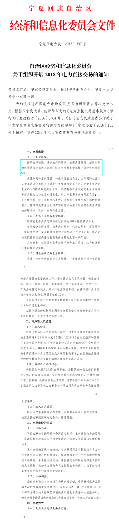 近日,寧夏經(jīng)信委發(fā)布《關(guān)于組織開(kāi)展2018年電力直接交易的通知》(以下簡(jiǎn)稱(chēng)“通知”),通知中稱(chēng),基數(shù)意外的電量需求全部進(jìn)入市場(chǎng),2018年交易電量不低于售電量的50%。