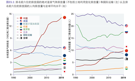 可以看出來,就排放總量而言,2019年中國已經(jīng)遠(yuǎn)遠(yuǎn)的超過了其他國家,甚至已經(jīng)是美國的2倍了,中國的碳排放差不多140億噸二氧化碳當(dāng)量,