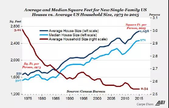 當(dāng)然了,國內(nèi)家庭各種家用電器也不少,怎么會跟美利堅老百姓有這么大的差距呢?首先我們的城市化水平還不如美國,還有幾億人住在農(nóng)村。其次美國的人均住房面積大,比歐洲和中國都大不少,會帶來對空調(diào),燈具和其他家電的使用也更為奢侈,下圖是美國的2015年新建的獨棟房屋的人均住房面積達(dá)到了1038平方英尺,超過96平米了,注意這可是人均啊,怪不得國內(nèi)中產(chǎn)和土豪都喜歡去北美買大house。