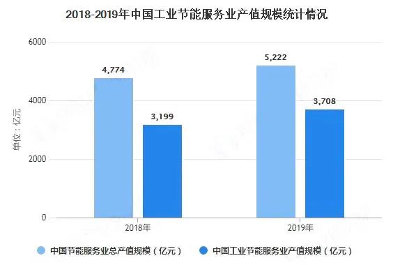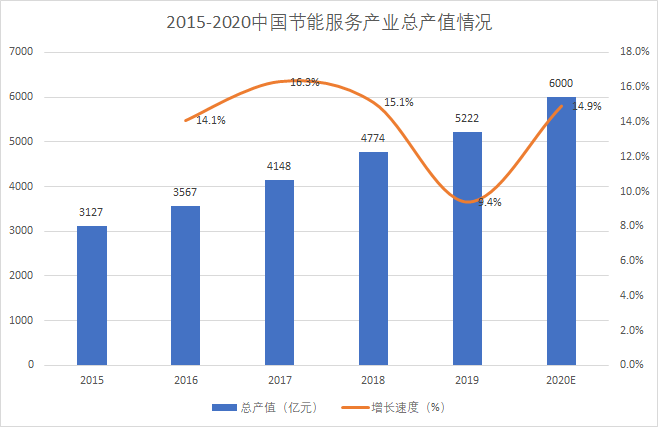 近年來,節(jié)能服務(wù)產(chǎn)業(yè)總產(chǎn)值不斷增長,呈逐年上漲趨勢(shì)。中國節(jié)能協(xié)會(huì)數(shù)據(jù)顯示,2019年我國節(jié)能服務(wù)產(chǎn)業(yè)總產(chǎn)值達(dá)5222億元,同比增長9.38%。根據(jù)《“十三五”節(jié)能環(huán)保產(chǎn)業(yè)發(fā)展規(guī)劃》,到2020年節(jié)能服務(wù)業(yè)總產(chǎn)值達(dá)到6000億元。我國節(jié)能服務(wù)行業(yè)潛力巨大。