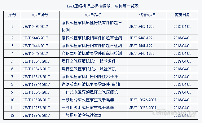 2017年第48號中華人民共和國工業(yè)和信息化部公告,工業(yè)和信息化部批準(zhǔn)發(fā)布了壓縮機行業(yè)標(biāo)準(zhǔn)12項看具體內(nèi)容見下表。