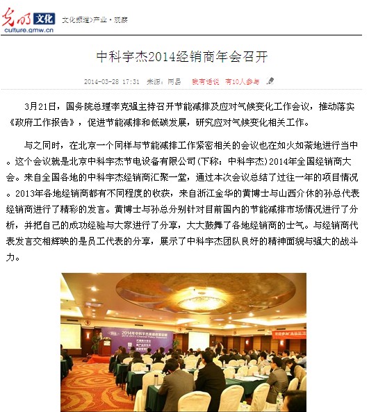 與之同時(shí),在北京一個(gè)同樣與節(jié)能減排工作緊密相關(guān)的會(huì)議也在如火如荼地進(jìn)行當(dāng)中。這個(gè)會(huì)議就是北京中科宇杰節(jié)電設(shè)備有限公司(下稱:中科宇 杰)2014年全國經(jīng)銷商大會(huì)。來自全國各地的中科宇杰經(jīng)銷商匯聚一堂,通過本次會(huì)議總結(jié)了過往一年的項(xiàng)目情況。2013年各地經(jīng)銷商都有不同程度的收 獲,來自浙江金華的黃博士與山西介休的孫總代表經(jīng)銷商進(jìn)行了精彩的發(fā)言。黃博士與孫總分別針對(duì)目前國內(nèi)的節(jié)能減排市場情況進(jìn)行了分析,并把自己的成功經(jīng)驗(yàn) 與大家進(jìn)行了分享,大大鼓舞了各地經(jīng)銷商的士氣。與經(jīng)銷商代表發(fā)言交相輝映的是員工代表的分享,展示了中科宇杰團(tuán)隊(duì)良好的精神面貌與強(qiáng)大的戰(zhàn)斗力。