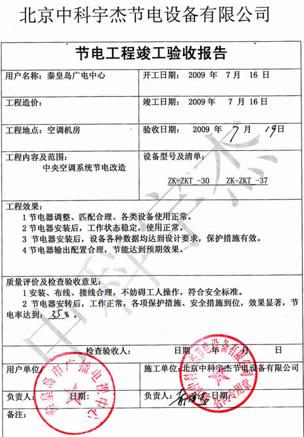 安裝調(diào)試驗(yàn)收,節(jié)能效率達(dá)到35%,節(jié)能效果非常明顯,投資回報(bào)期不到兩年,為秦皇島市廣播電視局得到了很好的經(jīng)濟(jì)效益和社會(huì)效益。